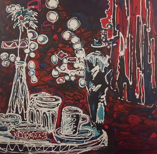 Why was Wild Bill a pop icon? This piece is lined with—what I call, cursive writing boxes which are stories upon stories with hand written facts about Bill, embedded in the coloured circles, rectangles and under-painting of this piece